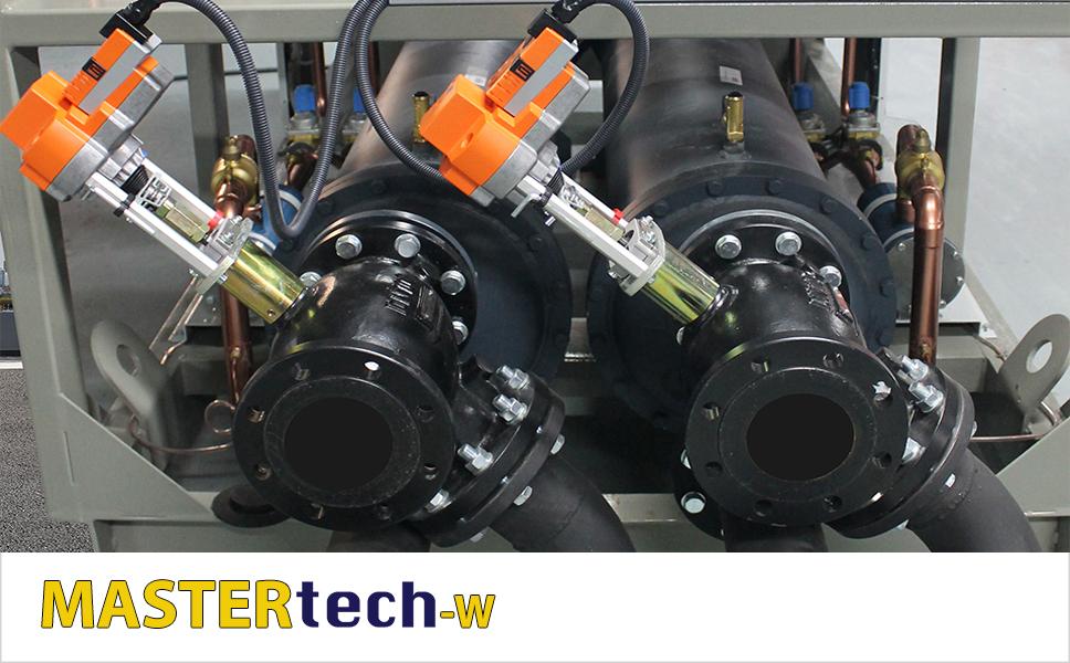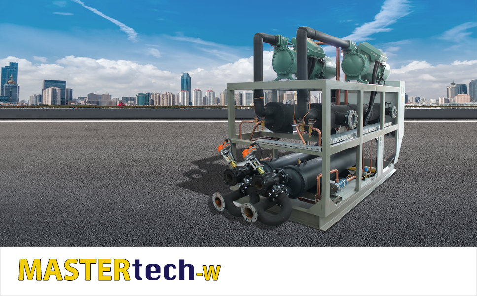A MASTERTECH-W vízhűtéses kondenzátorral dolgozik – ehhez külső hűtőtorony szükséges. A vízhűtéses kondenzátor lényegesen magasabb COP-ot eredményez, és a beltéri elhelyezés védi a berendezést az időjárástól.