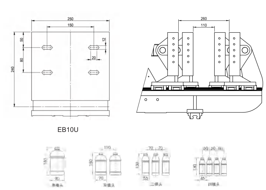 Az EB10U sorozat gyors kétállomásos (HIGH SPEED double station) fúvógép, amely az EB10H-hoz képest magasabb ciklussebességet biztosít ugyanolyan termékméretnél. Az EB10U50-30D variáns ko-extrúziós képességgel rendelkezik (Ø50+Ø30 mm csigakombináció), amely lehetővé teszi kétrétegű barrier flakonok gyártását már kis méretben is. Alacsony tömegközéppontú keret és elektronikus lineáris mérőszalag gondoskodik a pontos, ütésmentes formazárásról.