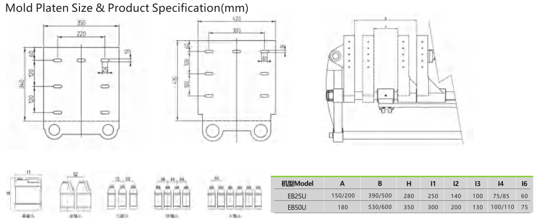 Automata kétállomásos extrúziós fúvógép, max. 5 L, 140 kN záróerő. Szervovezérlésű és ko-extrúziós változat is. Modellek: EB50U75S, EB50U85S, EB50U75-25SV, EB50U75-45D.